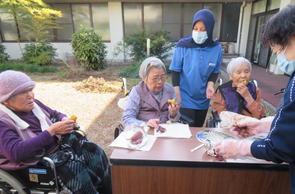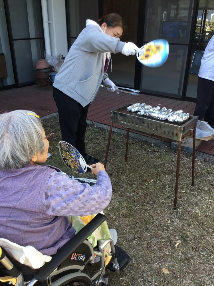 ご利用者様にもお手伝いいただき、お芋を焼いていきます♪